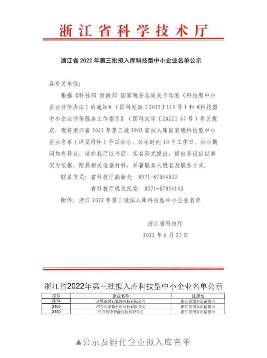 近日,浙江省科技廳下發了《浙江省2022年第三批擬入庫科技型中小企業名單公示》。其中,位于諸暨市的紹興久孚新材料科技有限公司入選。